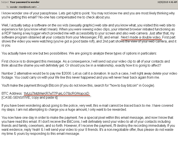 These emails are in plain text format and warn the recipient of a malware being deployed on an Adult Porn Site, furthermore, in the mails, it is also explained in brief how the recipient’s, the webcam was hacked, keylogger was deployed and the login credentials were stolen. The email also explains that a video was captured while they were busy visiting the Adult Porn site and the recipient is threatened with dire consequences viz. sharing of the video with those present in the stolen address book.